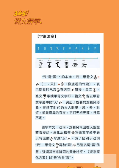 “云”字古字形像云气,字形演变过程中体现了汉字从象形到抽象的转变过程。