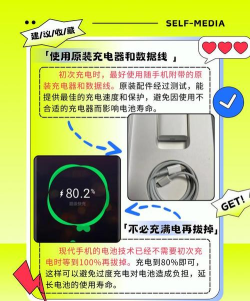 新手机电池充电建议:首次充电可充满后继续充电约1小时,日常使用建议充满即拔,避免整夜充电。使用原装充电器,避免高温、过冷环境,充电时勿使用手机,以防过热引发危险。
