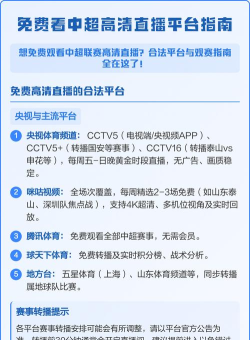 观看中超直播可通过腾讯体育、爱奇艺体育、PP体育等平台,或使用手机APP随时随地观看。部分平台提供免费直播,建议选择稳定网络以确保流畅体验。