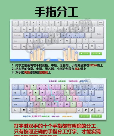 原来是专门为了打字用的。 它不仅可以帮你把手指放置到正确的位置: 两个食指分别放在F键和J键,其余手指依次向两边放置,拇指统一放在空格上,即: 注意右手的小拇指放在:;键 其次是盲打时:如果速度很快,一部分手指还未落下,另一部分就已经抬起,双手会产生悬空感,容易忘记手指要落在哪个字母以及放下的手指到底落了在哪个字母上。 而这个突起,就可以帮助我们在盲打时,定位手指摆放的位置。 3,熟悉键位,记忆键...