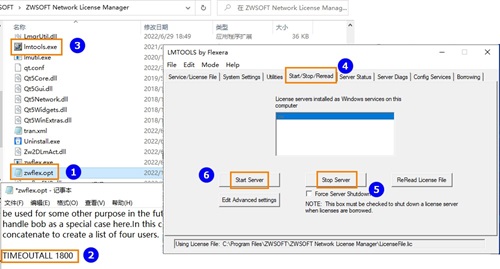 4. 打开网络许可配置程序【lmtools.exe】,停止再启动中望授权服务,设置生效。