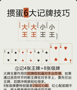 1.记牌技术 掼蛋高手也是记牌高手. 新手水平:记住4个王,6个主. 初级水平:记住4个王,6个主,2个 红桃配配有没有出,8个A. 高级水平:记住4个王,6个主,2个红桃配配,8个A,所有的花牌. 一流水平:不但能记牌,而且每个人第一手,出的是什么,开炸后出了什么. 超一流水平:打完牌把牌扣上,他可以复盘.