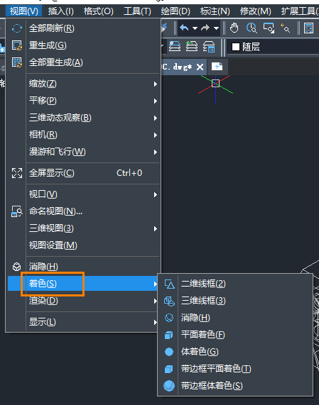 CAD三维图形的显示效果,可以在菜单【视图-着色】里进行选择,包含七种,如下图。