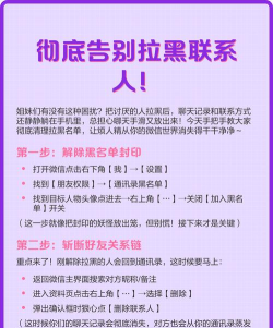 方法一 通过短信息联系她,当微信被拉黑后不要马上联系对方,过两天以后等对方冷静了说不定会将你拉出黑名单的,两天后如果对方还是没有反应建议你可以发短信,说一些真诚的话主动一些联系对方,对方一心软在加上并没有真的想删除你,是会将你拉出黑名单的. 方法二 微信被拉黑可以打电话联系,也是建议不要马上打电话,因为刚拉黑情绪可能还不稳定正在气头上,等两天后打电话给对方,说一些换回的话,可以叫对方出来吃顿饭看个...