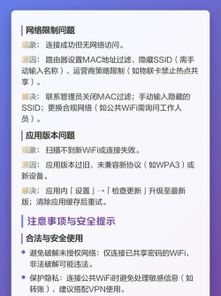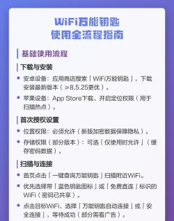 WiFi万能钥匙通过扫描二维码或手动连接热点实现上网,支持手机和电脑连接,部分场景需使用访客网络或重启路由器。