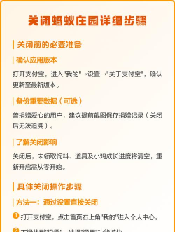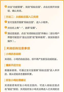 关闭蚂蚁庄园功能可通过支付宝进入游戏设置,选择账户选项并确认关闭操作,此方法可永久禁用游戏功能。