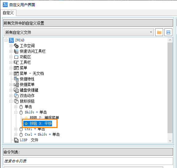 在【ZWCAD-鼠标按钮-Shift+单击】上右键,选择新建按钮,会添加【按钮3】,这个按钮即为【Shift+中键】,自定义添加需要的功能命令即可。以上就是本文的全部内容,希望对你有所帮助。更多关于CAD的资讯请关注我们官网。
