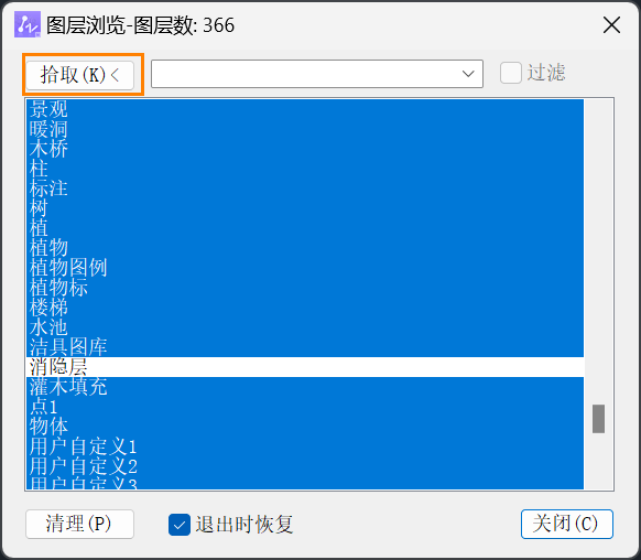 我们点击菜单【扩展工具-图层工具-图层漫步】(【laywalk】命令),在弹出对话框中点击【拾取】,所拾取到的对象所在图层即可才能显示