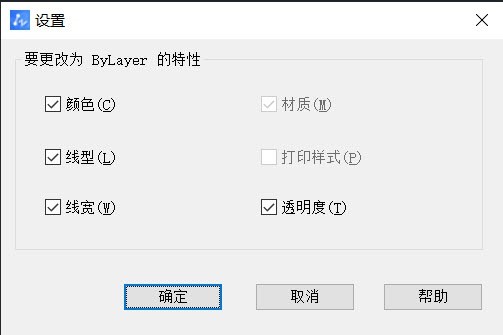 接着,输入命令分支【设置(S)】,打开设置对话框,勾选需要随层的特性选项并【确定】。