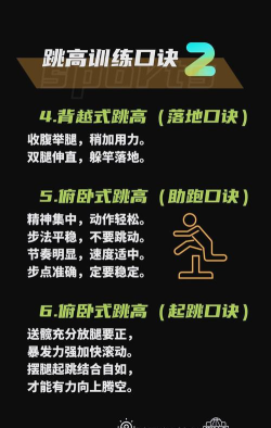 跳高训练包括助跑、起跳、过杆和落地技术,需科学系统进行,如早上热身、专项练习等。训练中需注意细节调整,确保达到最佳状态。