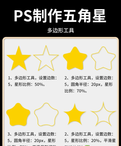 Photoshop的星形工具可用于快速绘制五角星,通过调整参数如边数和星形比例,可以灵活创建不同风格的五角星图形。
