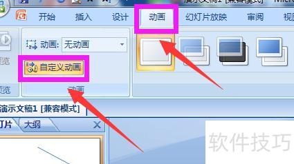 点击顶部动画菜单,选择自定义动画选项。