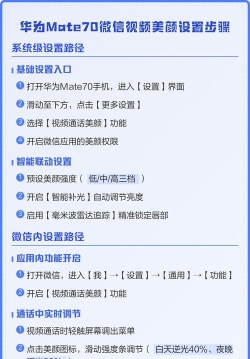 华为手机微信视频美颜功能可通过系统设置或相机预设开启,具体步骤包括进入设置、开启视频通话美颜选项,并在微信视频界面调整相关设置。