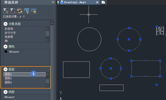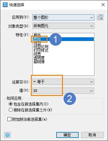 接着,在快速选择对话框种,选择【图层】特性,并指定需要更改的图层名称,确定后,即可选中该图层上的全部图形。