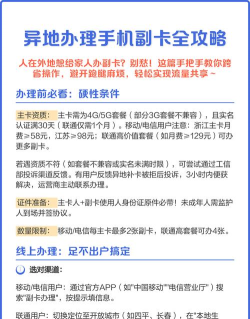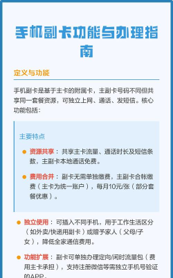 手机副卡办理流程通常包括主卡用户携带身份证前往营业厅或通过运营商APP在线申请,具体步骤因运营商而异。