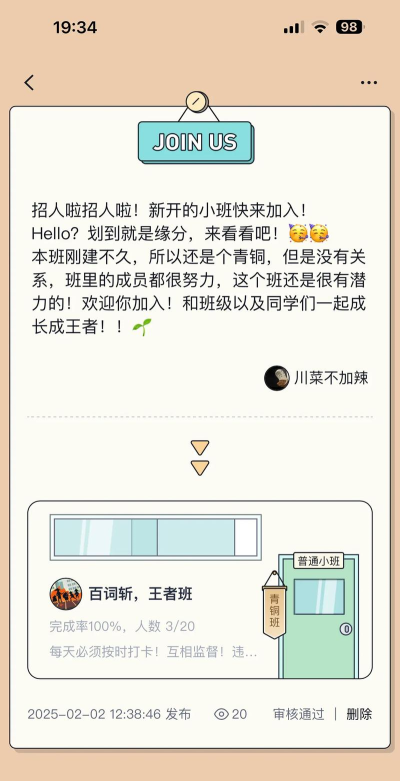 百词斩小班课程体验强调集体学习的氛围,用户可在其中找到志同道合的伙伴,通过打卡任务和奖励机制提升学习动力和效率。