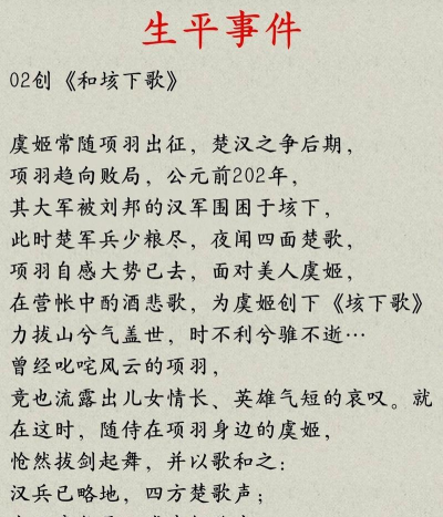 虞姬与项羽的爱情故事充满悲情,项羽兵败垓下时,虞姬以《虞姬之歌》回应,最终拔剑自刎,象征忠贞。
