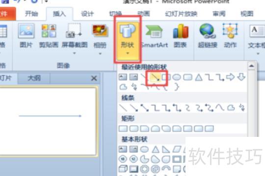 接着点击形状下方的下拉箭头,在弹出界面中选择带箭头的直线,操作所示。