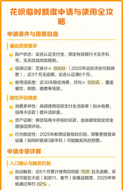 花呗临时额度的申请需用户保持良好信用记录,合理消费习惯,账号资质符合系统要求,具体条件可能因用户情况而异。