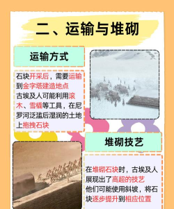古埃及金字塔建造方法涉及工匠使用石块堆砌与土坡辅助法,胡夫金字塔高146.5米,由230万块石块建成,每块重约2.5吨,石块间无黏合物,靠精准咬合垒成。