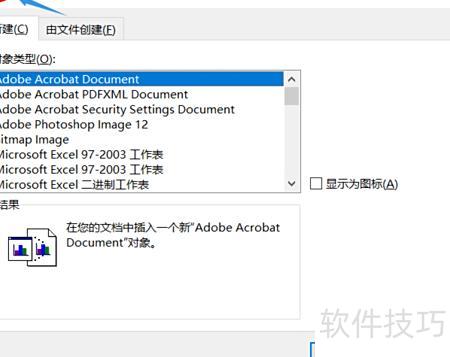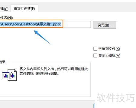 切换至Word,点击插入中的对象,在弹出的对话框中选择由文件创建。