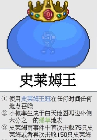 召唤方法 1.使用史莱姆王冠主动召唤 2.或在史莱姆雨事件中击杀 150 只(如果已被击杀过,则为 75 只)史莱姆之后出现 3.小概率在地图的靠外的三分之一范围内自然生成 召唤物合成: