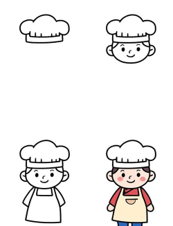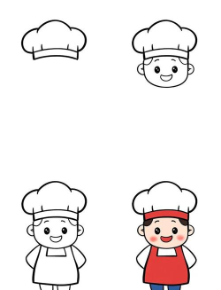 介绍厨师简笔画的基础绘制方法,包括从头部到手部的分步指导,适合初学者快速上手。