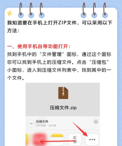 手机解压zip文件的方法包括:使用自带文件管理器长按文件点击解压;下载第三方压缩软件如ES文件浏览器、全能压缩等;使用在线解压网站上传解压;通过微信或金山文档小程序打开解压。