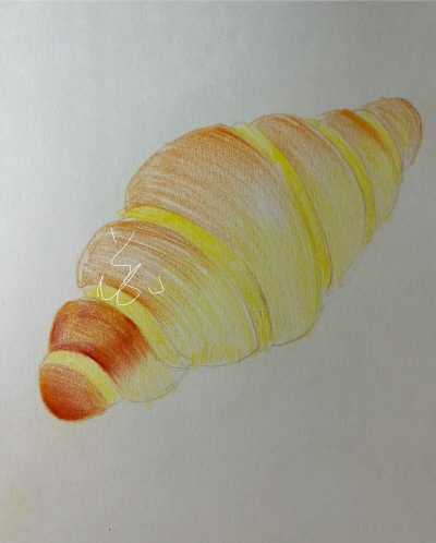 面包边缘的地方深拿浦黄➕黄褐色➕一点点的锡耶纳褐去刻画,趁湿在面包上点入一些偏黄的一色,适当的点入一些它的对比色紫色进去,特别点在面包凹进去...