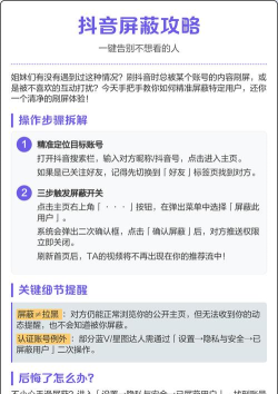 抖音屏蔽博主可通过进入个人主页,点击关注或粉丝列表,选择屏蔽目标,避免相关内容推送。