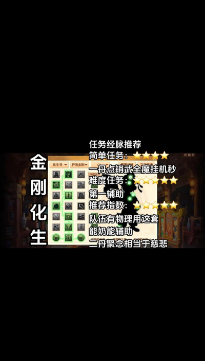 魔化生经脉加点推荐:任务加点推荐“销武—磅礴—归气—舍利—佛性—映法—渡劫金神身—杏林妙手”,核心强化法术威力;PK加点推荐“止戈—佛眷—心韧—感念—妙悟—流刚—诸天看护—护法金刚”,兼顾辅助与进攻能力。