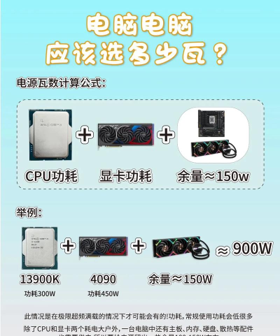 电脑电源功率选择需根据整机功耗估算,建议在实际功耗基础上增加150W余量,确保稳定供电。例如290W实际功耗可选450W电源。