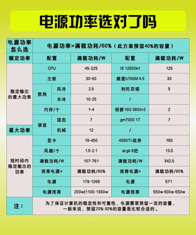 不同配置需不同电源功率,如高性能显卡需500W以上,低功耗CPU可选450W电源,具体需根据硬件需求调整。