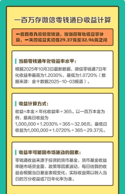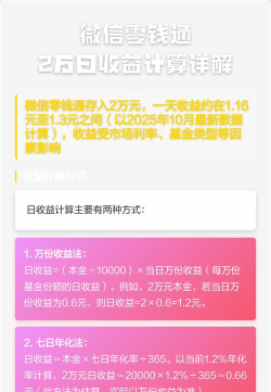 微信零钱通收益计算公式为:当日收益=(账户资金/10000)*基金公司当日每万份收益。具体计算需根据实际每万份收益数据进行。