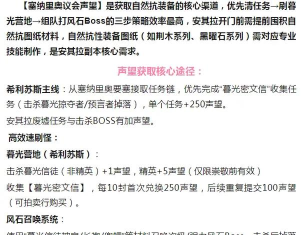 塞纳里奥议会声望刷法中,战地任务和击杀风石BOSS是重要途径,通过完成这些任务和击败BOSS,玩家可获得额外声望奖励,提升效率。