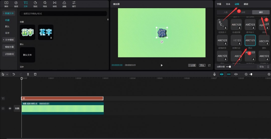 第二步:随后点击文字菜单,选择默认文本,将其添加到文字轨道上(如图所示)。