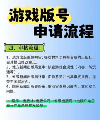 游戏版号申请流程包括提交游戏包、介绍说明书及公司资质等材料,经出版社初步审核后,由地方出版局和国家新闻出版总署逐级审批,流程复杂且需多次修改。