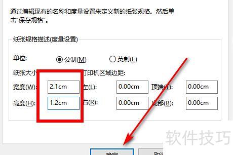 在下方输入纸张尺寸,宽2.1、高1.2,点击确定即可完成格式设置。