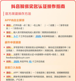 抖音实名认证解绑需通过官方客服咨询,具体流程可能涉及注销账号,但会清空所有信息,建议联系抖音官方获取详细指导。