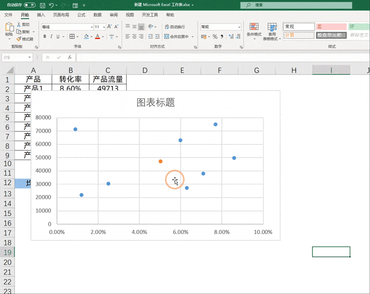首先选取转化率和流量两列数据,点击插入功能组中的散点图选项,插入图表。接着点击选择数据,在弹出窗口中添加新数据系列,将X轴设为平均转化率,Y轴设为平均流量,确认后图表中会显示一个橙色散点,该点即为所需的分割点。