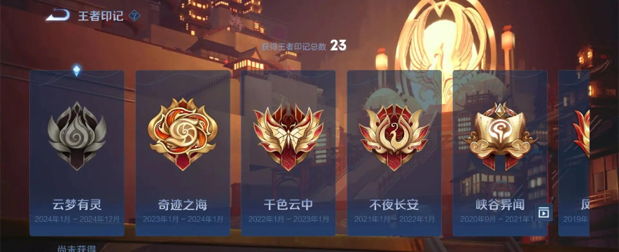 王者印记与赛年皮肤奖励相关,连续四个赛季达到王者段位可免费获取赛年皮肤,如项羽九幽镇关皮肤,部分英雄新皮肤也可通过印记获取。