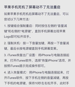 苹果手机死机时,可通过特定按键组合强制重启,如同时按住电源键和Home键(或音量键)5秒以上,直到出现苹果标志。不同型号操作略有差异。