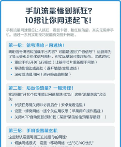 手机流量网速慢可通过重启设备、清理缓存、更换SIM卡或调整路由器位置等方式优化,减少同频段干扰。