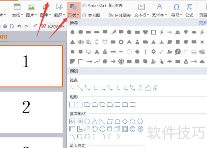 在第一张幻灯片上单击鼠标,选择插入菜单中的形状,挑选喜欢的图形,在幻灯片中添加箭头等元素。