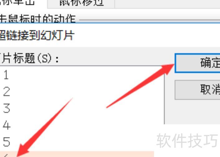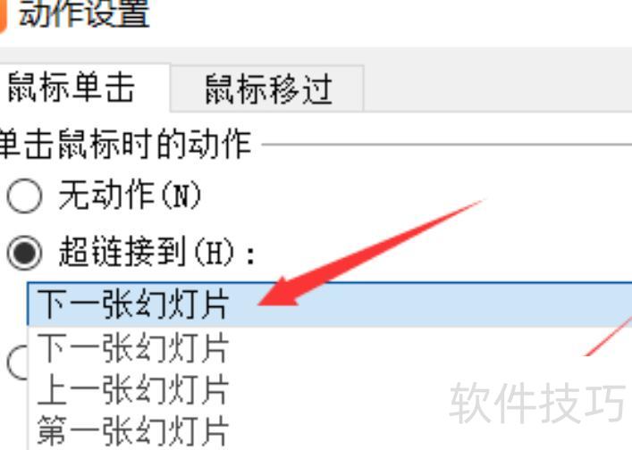在动作设置中选择超链接到,然后从下拉菜单里选取目标幻灯片。