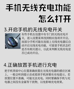 无线快充使用方法包括将兼容设备放置在充电板上,确保对齐,部分设备需开启无线充电功能,如手机设置中开启选项。汽车无线充电器需连接点烟器接口,放置手机即可充电。