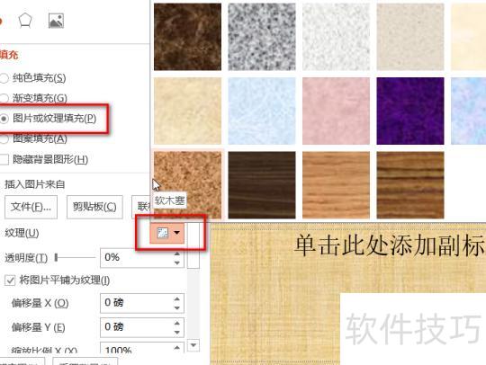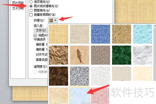 在设置背景格式工具栏中,选择填充下的图片与纹理填充,随后点击纹理选项进行设置。