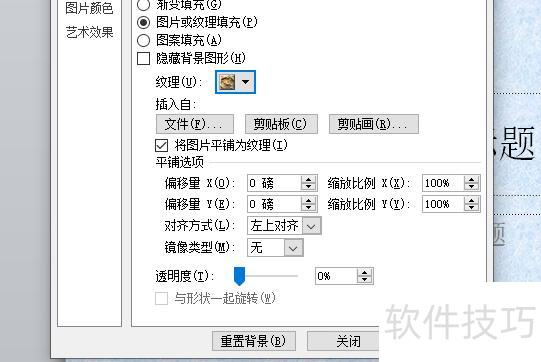 在背景格式设置中,选择填充,并勾选图片或纹理填充。