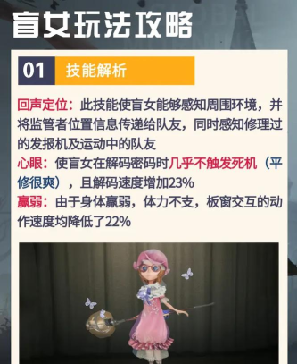 盲女容易被监管者抓到,需练意识和苟活能力,避免速溶,同时利用声音感知监管者动向,提高生存几率。