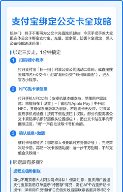 手机绑定公交卡需开启NFC功能,通过手机钱包或公交APP将实体卡贴近手机背面读取信息,完成绑定。支持多卡绑定,可为亲友充值,部分手机如苹果暂不支持。